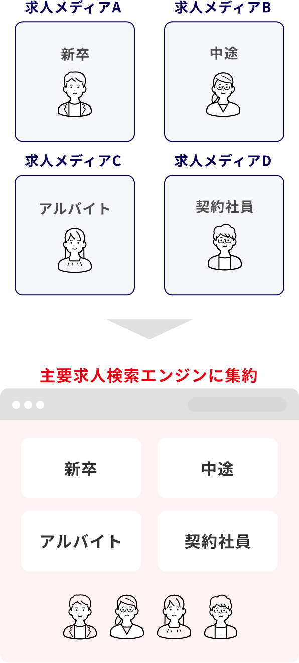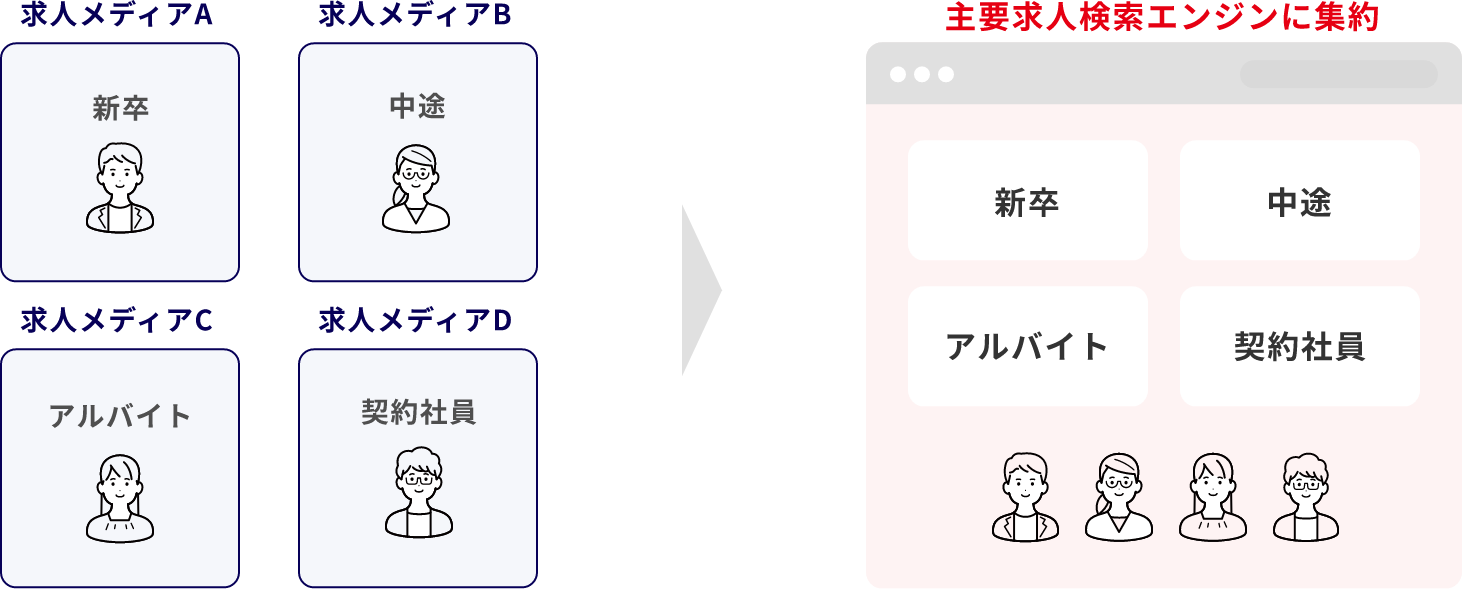 Indeedをはじめとする求人検索エンジンに、すべての雇用形態の求人を掲載し拡散することで、